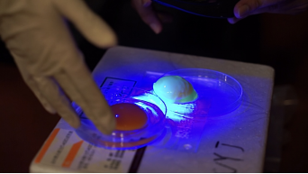 科普活动上,陆阳清教授的研究生们还为同学们带来了有趣的“绿色荧光蛋白”生物实验。在卵清蛋白基因中加入绿色荧光蛋白,经过蓝色激光激发出绿色荧光,一个发绿光的蛋清就这样神奇地呈现在大屏幕上。有趣的生物实验搭配陆教授的原理讲解,赢得同学们的阵阵赞叹和掌声。