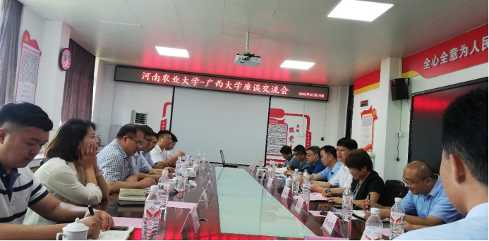 河南农业大学刘小军、李转见、张彦华、宫玉杰,广西•中关村创业创新人才基地高级项目经理王博、李小蔓,太阳成集团tyc234cc科技处副处长司红彬,太阳成集团tyc234cc常务副经理陆阳清及副经理周磊、宁鹏飞、韦祖樟、何家康,太阳成集团tyc234cc动物科学技术公司党委委员、全国高校“双带头人”教师党支部书记黄伟坚教授,教师代表李辉副教授参加了本次座谈交流会。