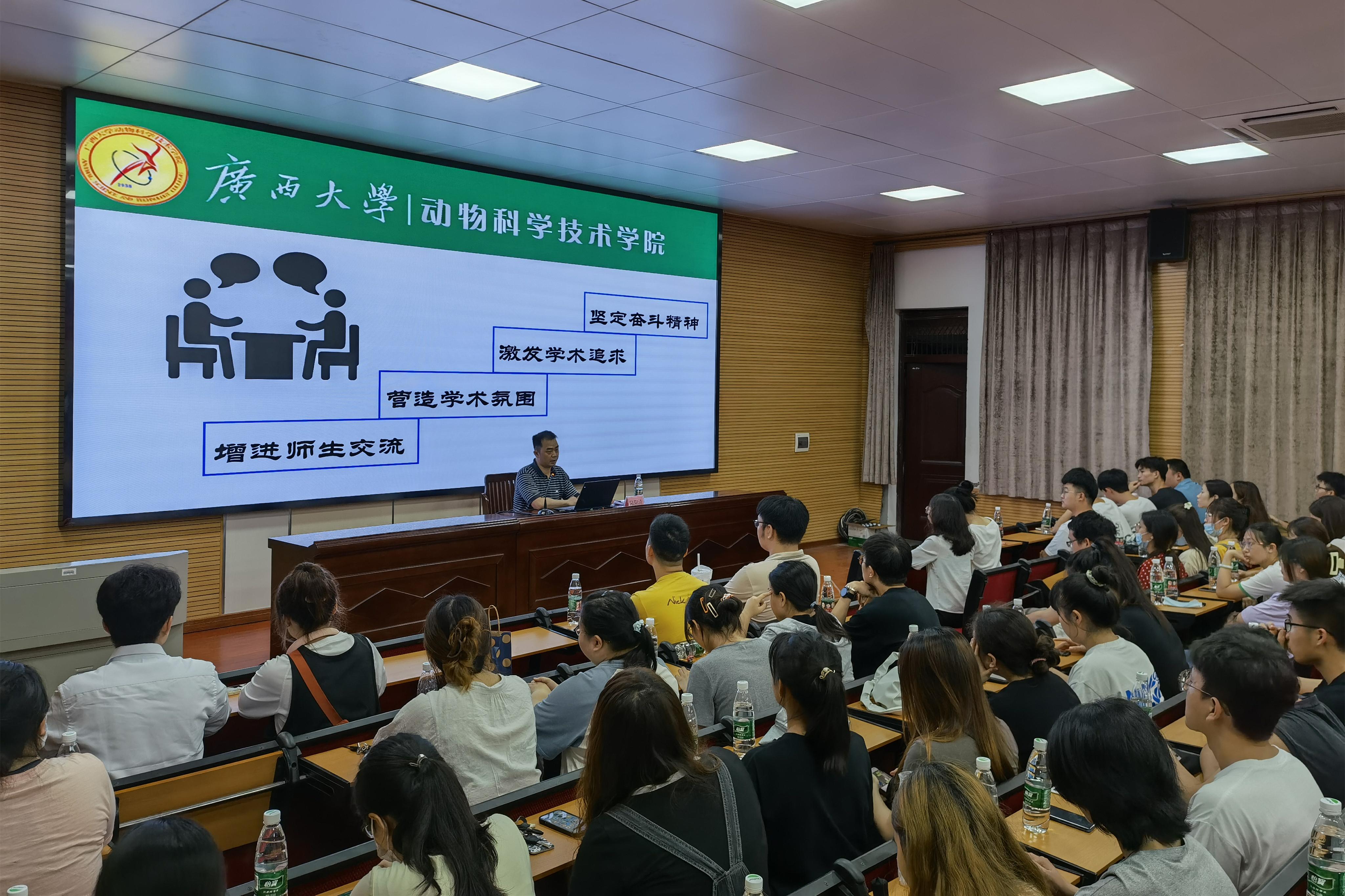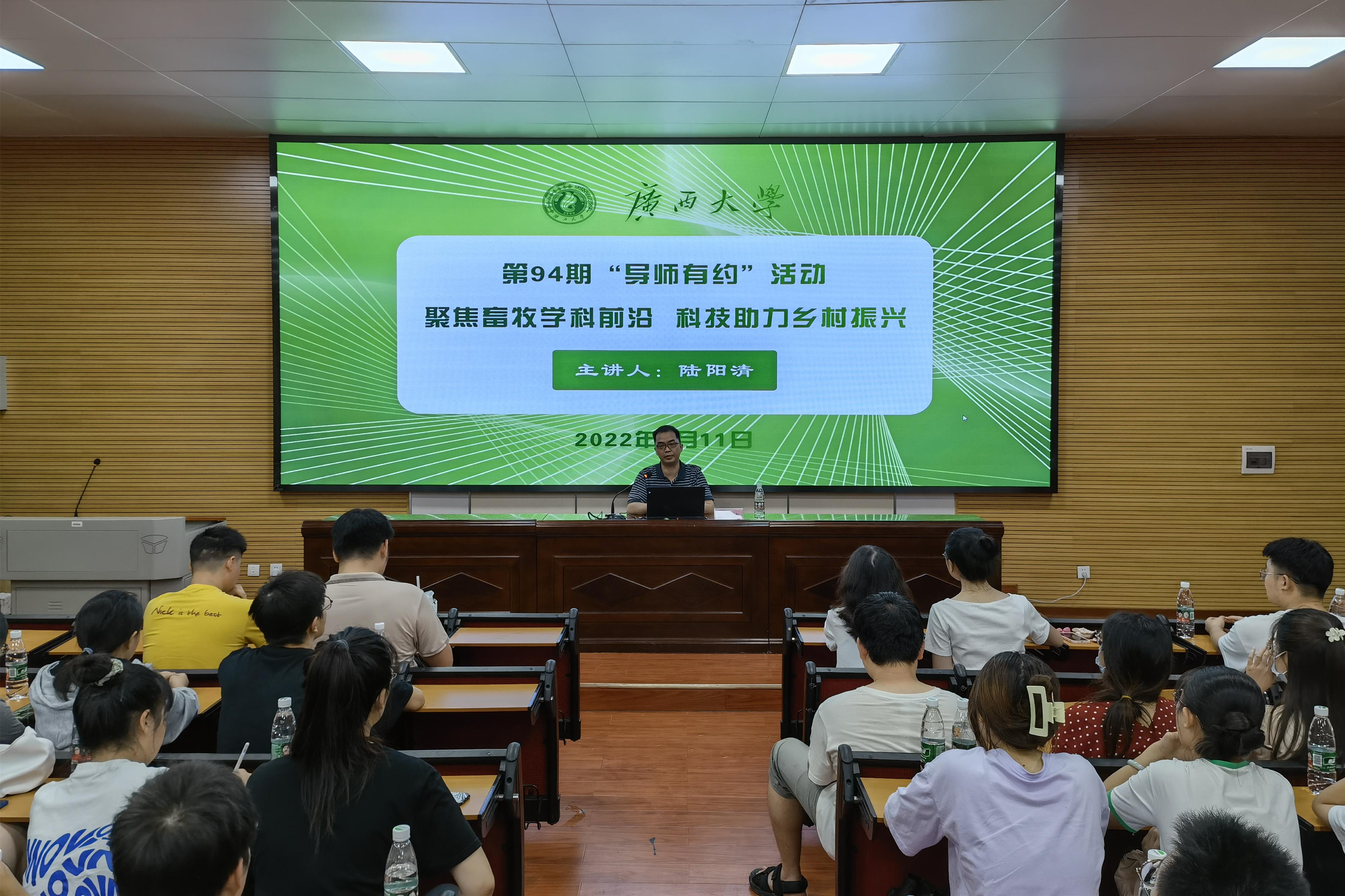 6月11日晚上,太阳成集团tyc234cc第94期“导师有约”活动在太阳成集团tyc234cc318报告厅举行,主题为“聚焦畜牧学科前沿,科技助力乡村振兴”,太阳成集团tyc234cc常务副经理、教授、博士生导师陆阳清受邀主讲。太阳成集团tyc234cc团委副书记刘诚,以及2021级畜牧学、畜牧专业全体硕士生参加此次活动。