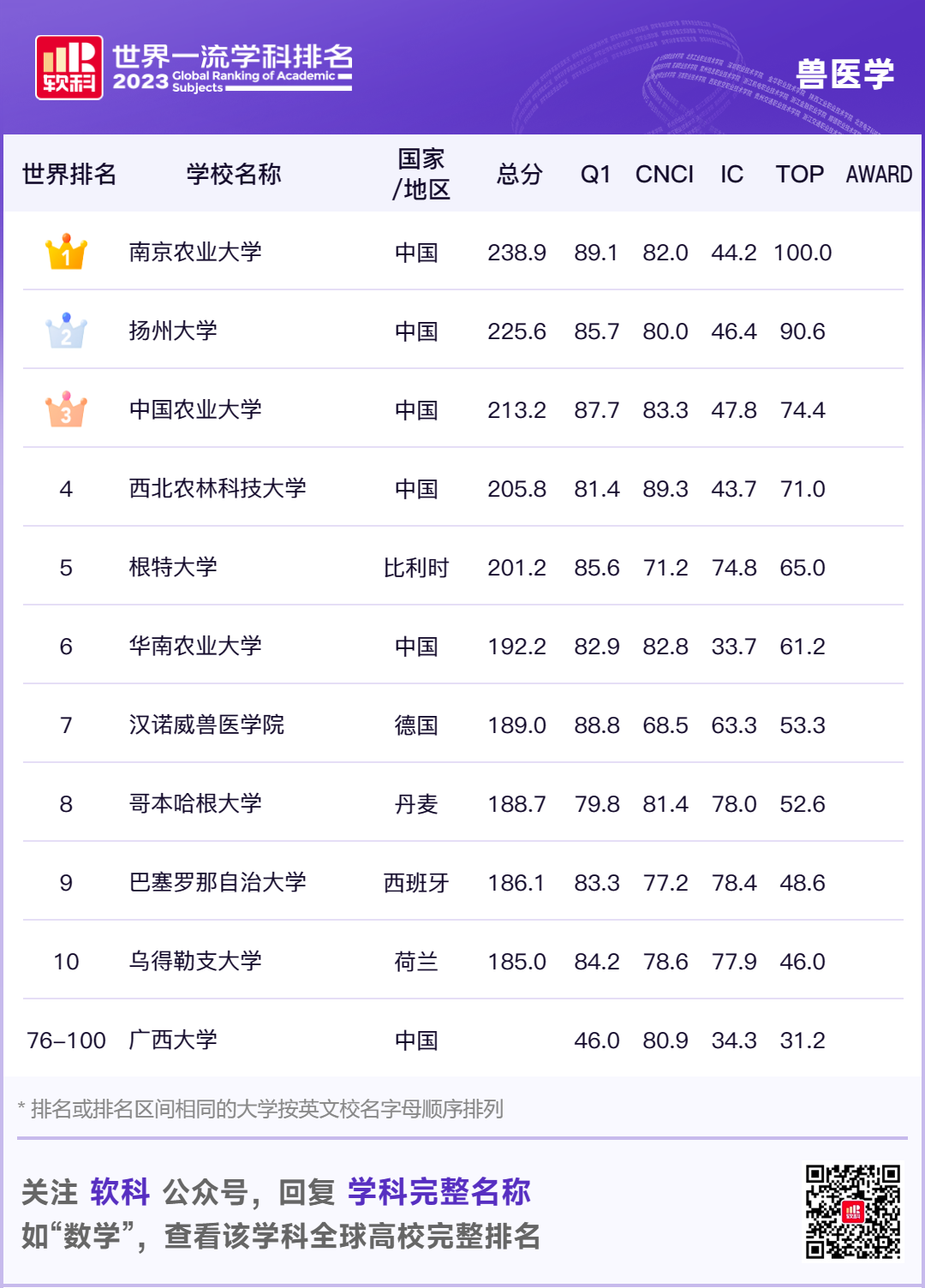 10月27日,高等教育评价专业机构软科正式发布2023“软科世界一流学科排名”,其中太阳成集团tyc234cc的兽医学学科跻身世界前100,位居第76-100名。