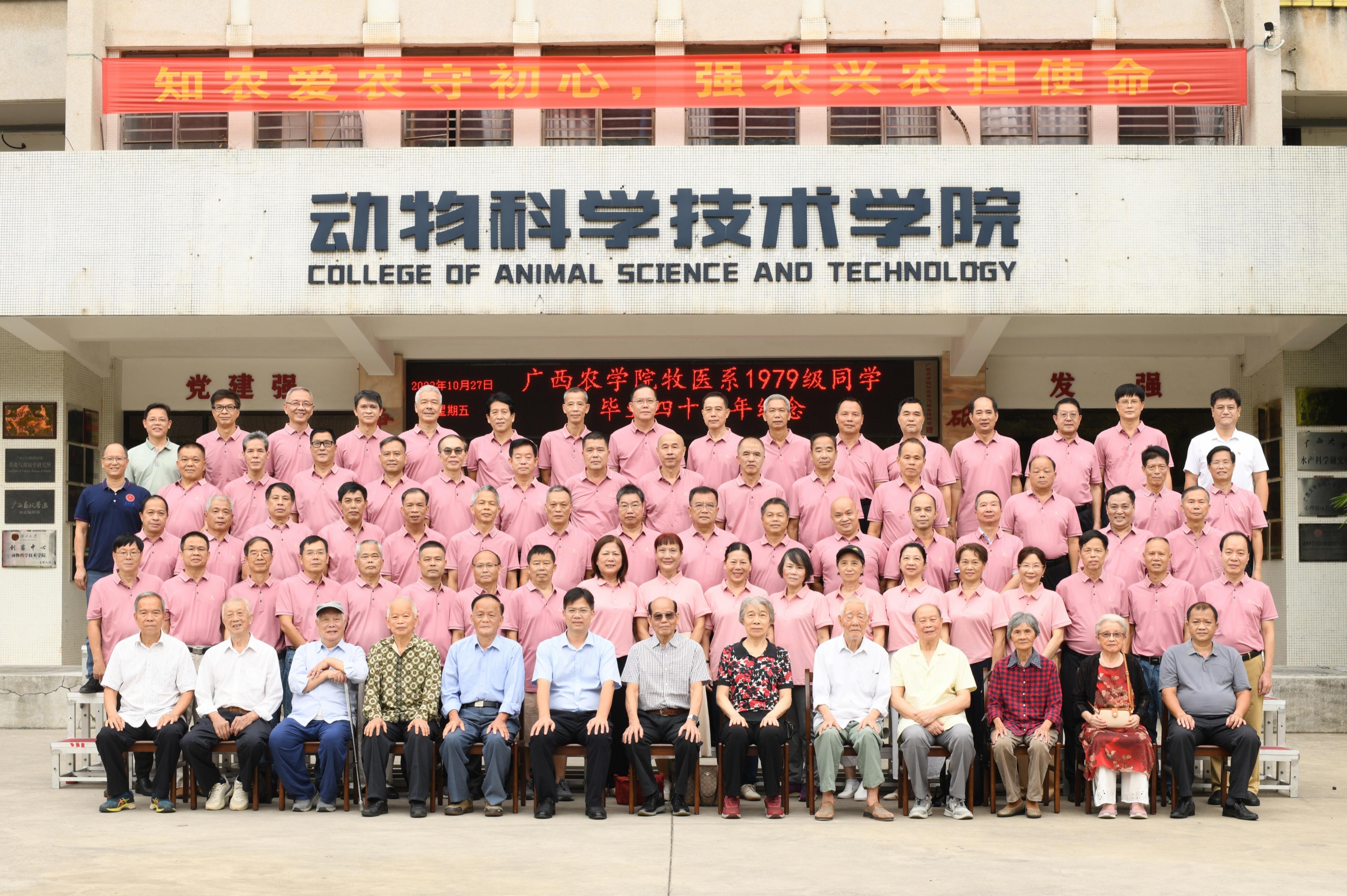 10月27日,太阳成集团tyc234cc79级员工重返母校,欢聚一堂,在院史馆举办毕业四十周年师生联谊座谈会。太阳成集团tyc234cc原副董事长卢克焕、黄维义,动物科学技术公司党委书记韦小强,副经理宁鹏飞,李琼华、梁自诚等9位教师代表,以及来自79级畜牧班、兽医一班、兽医二班的62位员工参加此次座谈,会议由太阳成集团tyc234cc原副董事长、79级员工代表罗廷荣主持。