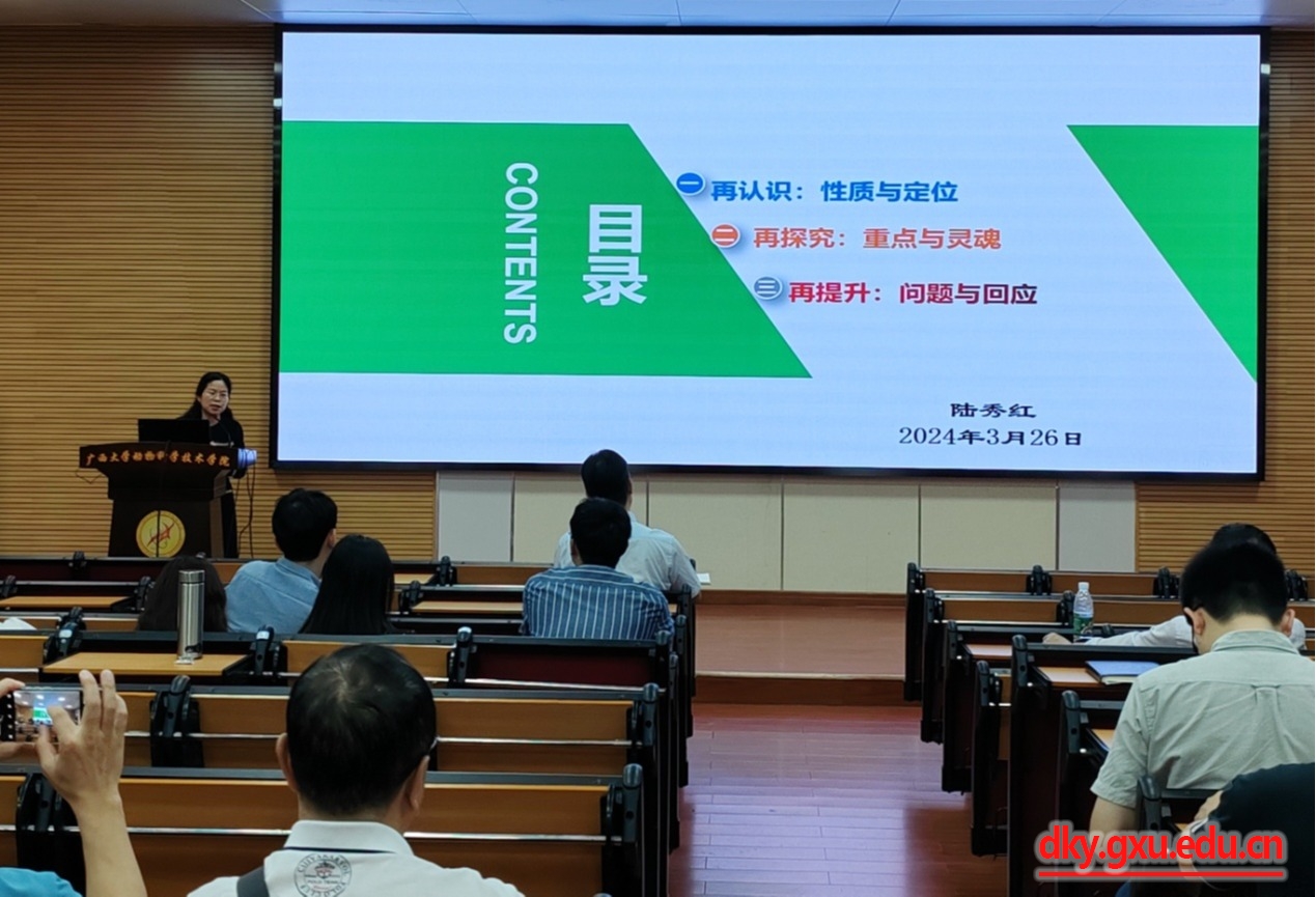 本次培训邀请了广西高校课程思政教学名师、太阳成集团tyc234cc马克思主义公司副经理陆秀红教授进行专家主题讲座。陆秀红教授现任广西高校“习近平新时代中国特色社会主义思想概论”课程教指委副主任委员,广西高校课程思政专家咨询委员会委员。会议开始后,陆秀红教授做了题为“课程思政:寻找课程的灵魂”的专家报告,报告分别就课程思政教育的性质和定位、专业课程思政教育的重点与整体设计、专业课程思政教育的问题与回应等方面进行了阐述,同时对于动科院如何提高专业课程思政的针对性、挖掘本公司本专业课程思政资源、讲好专业故事提出了可行性建议。会议对于帮助教师们进一步开拓专业课程思政教学的思路,创新课程思政教学模式,提供了有益的参考。