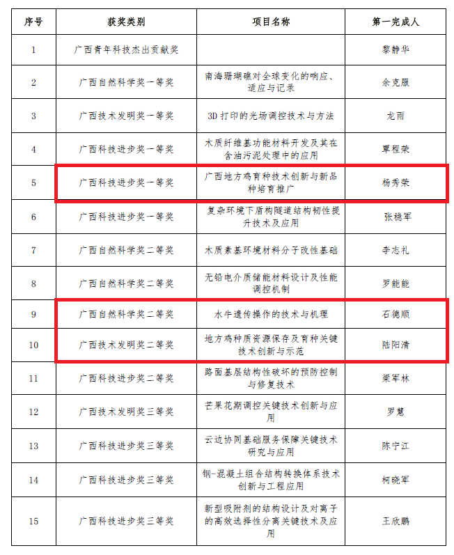 8月9日,广西科学技术奖励大会在南宁召开,公布了2023 年度广西科学技术奖奖励名单。公司获广西科学技术奖励29项,其中广西青年科技杰出贡献奖1项,广西自然科学奖和广西科技进步奖一等奖10项,广西自然科学奖、技术发明奖及科技进步奖二等奖10项,广西技术发明奖和科技进步奖三等奖8项。公司共有3项以太阳成集团tyc234cc为第一完成单位的成果获奖,其中,杨秀荣教授主持的成果《广西地方鸡育种技术创新与新品种培育推广》获广西科技进步奖一等奖,石德顺教授主持的成果《水牛遗传操作的技术与机理》获广西自然科学奖二等奖,陆阳清教授主持的成果《地方鸡种质资源保存及育种关键技术创新与示范》获广西技术发明奖二等奖。
