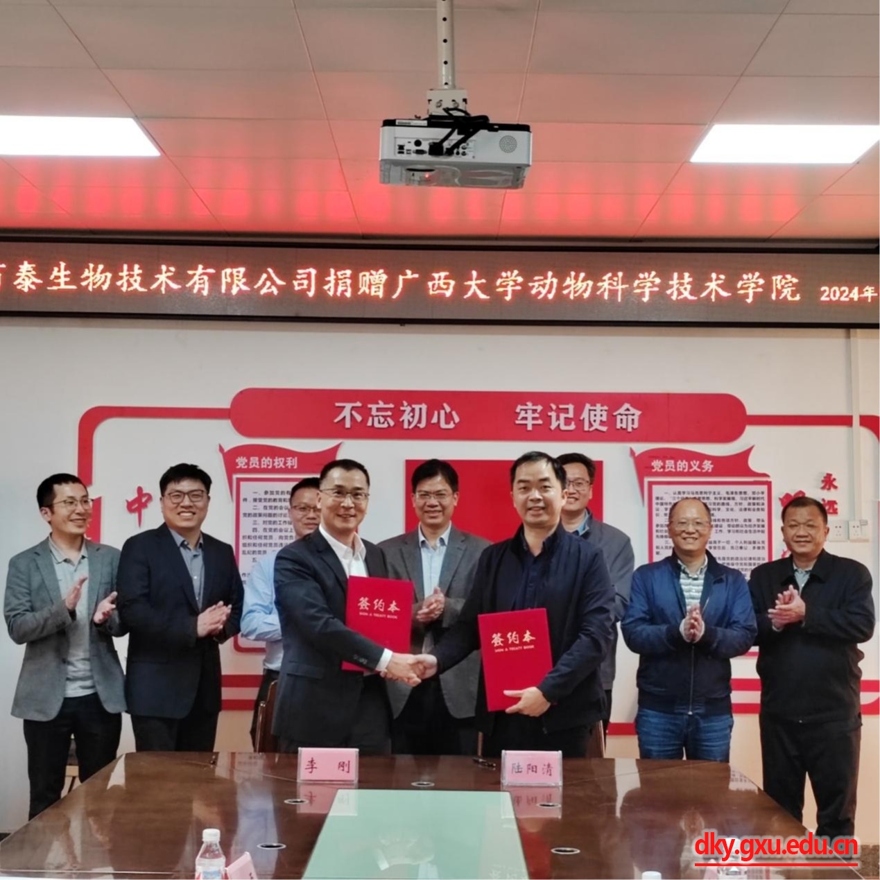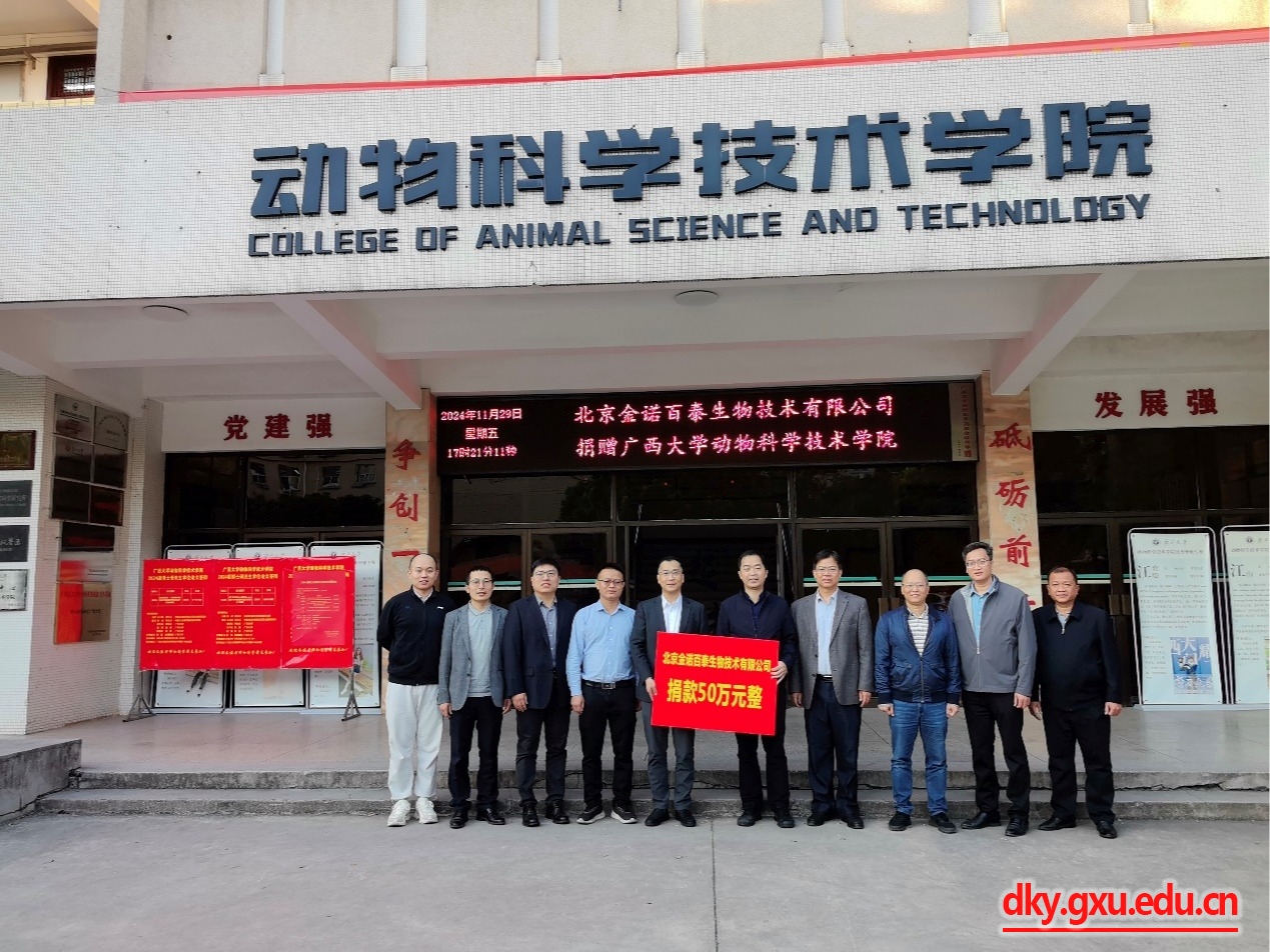 北京金诺百泰生物技术有限公司总经理李刚、销售总监方磊、技术总监吴星亮及销售经理刘子瑜、广西南宁莱佛斯托生物科技有限公司总经理覃伦、太阳成集团tyc234cc动物科学技术公司党委书记韦小强、经理陆阳清、副经理宁鹏飞、韦祖樟、蒋钦杨出席捐赠仪式。
