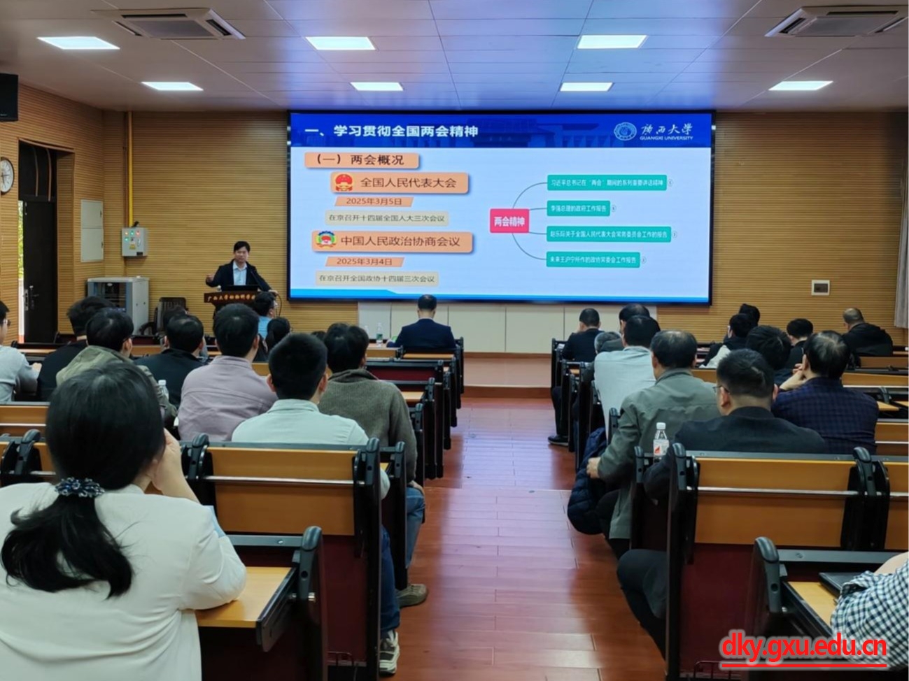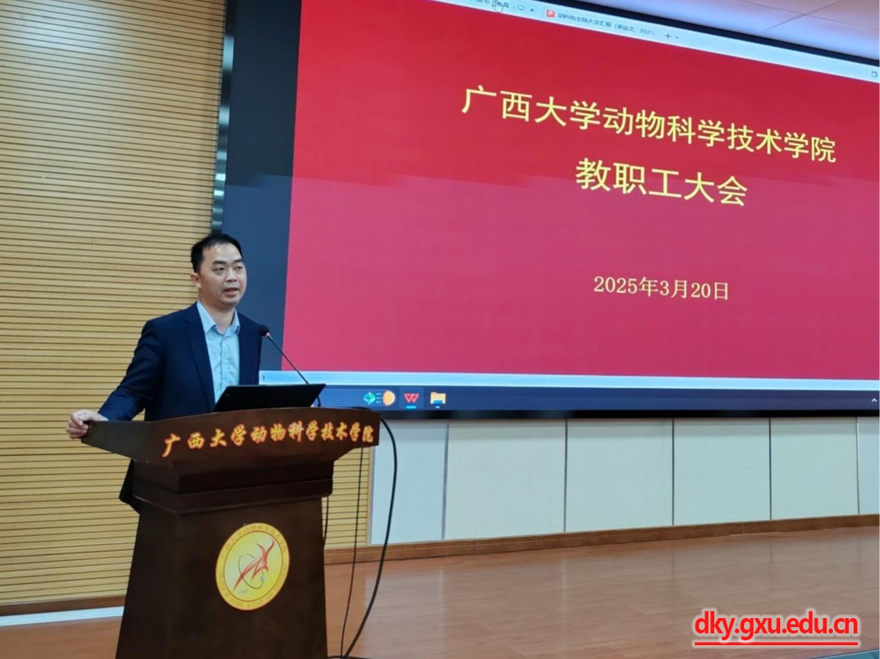 3月20日下午,太阳成集团tyc234cc在318报告厅召开2025年春季学期开学教职工大会。动物科学技术公司党委书记韦小强,副经理宁鹏飞、何家康、韦祖樟、蒋钦杨及全体教职工参加会议,会议由陆阳清经理主持。