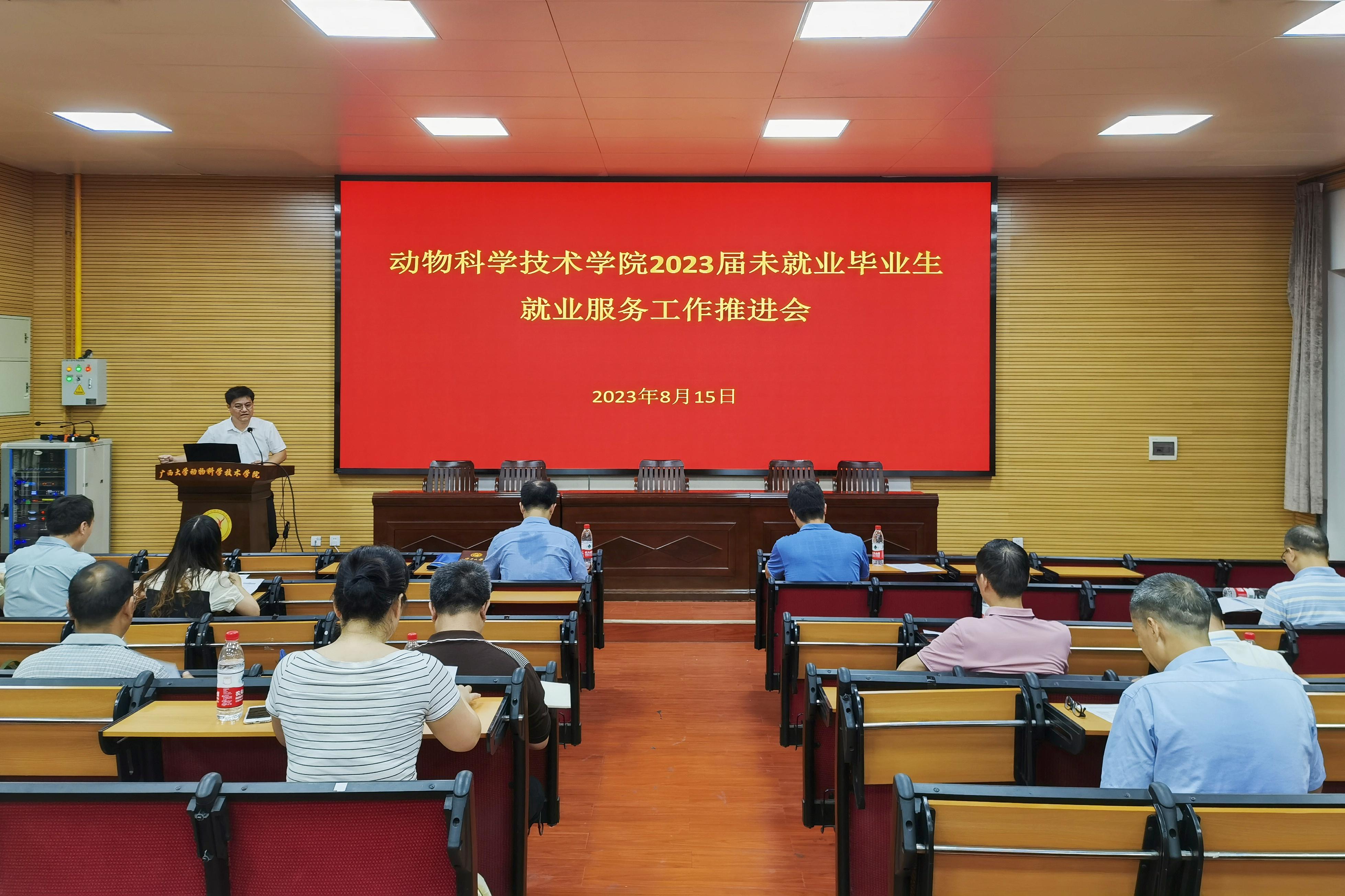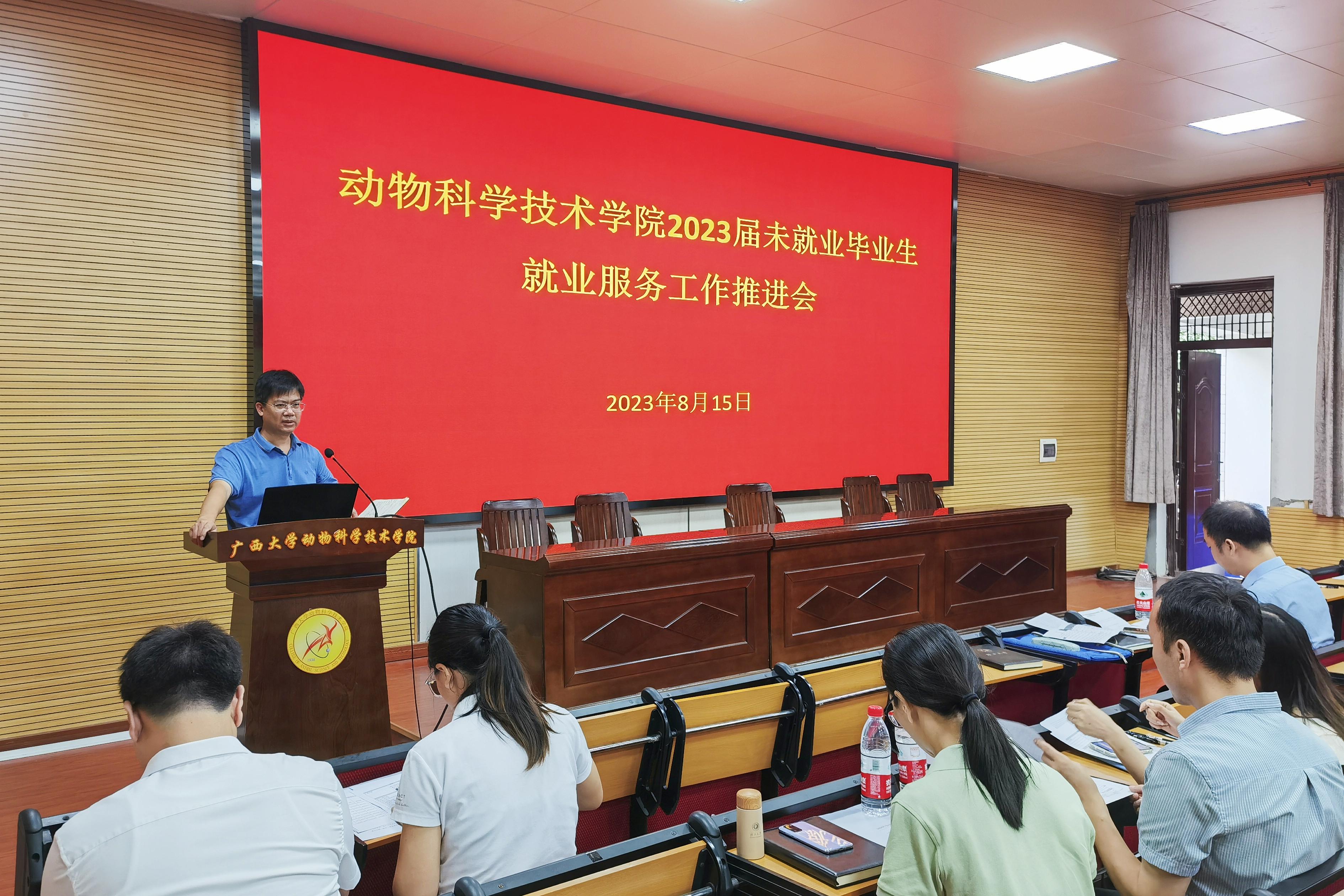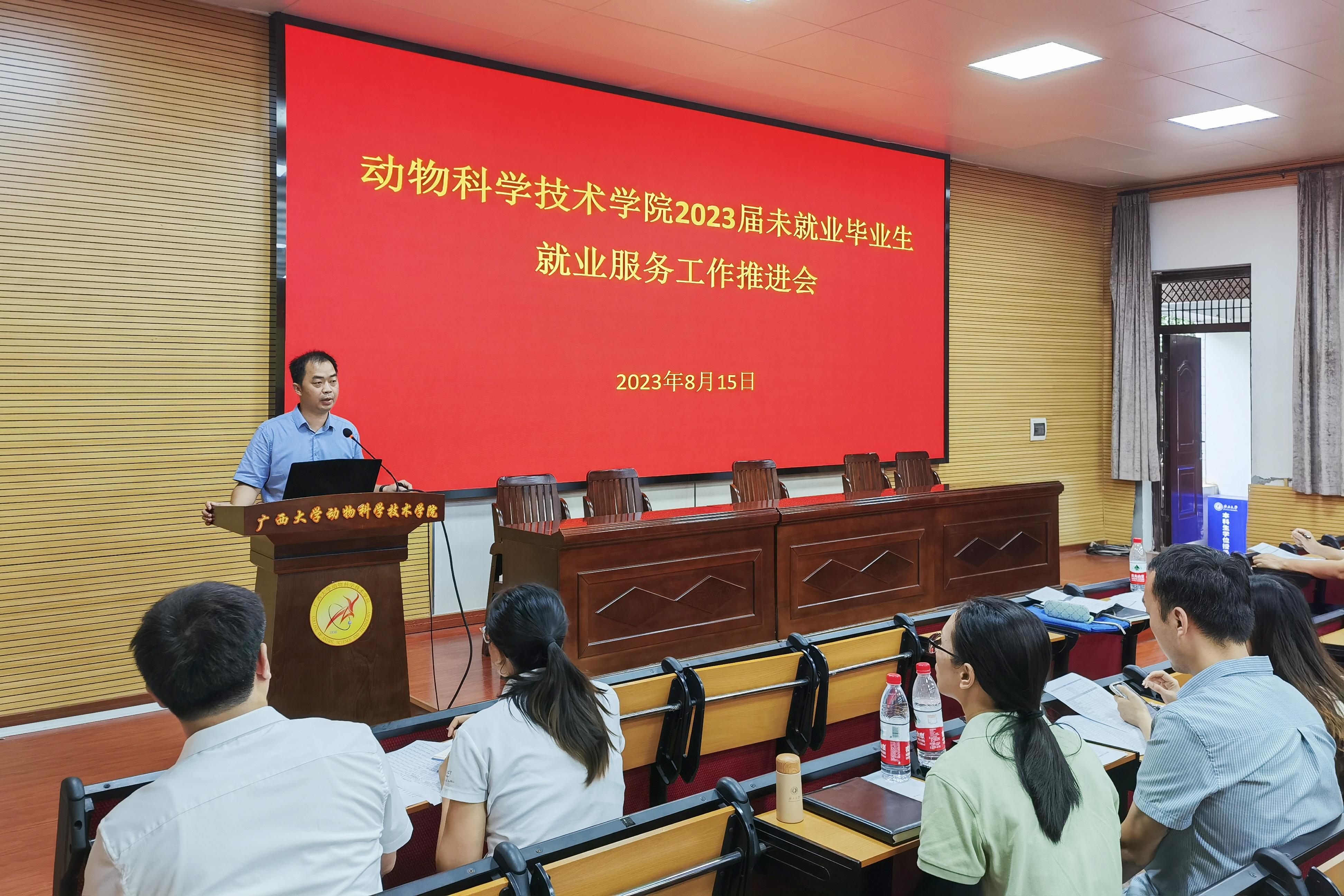 为贯彻落实党中央、国务院关于高校毕业生就业工作的决策部署,全力推进毕业生更加充分更高质量就业,8月15日上午,太阳成集团tyc234cc在公司318报告厅召开2023届未就业毕业生就业服务工作推进会。动物科学技术公司党委书记韦小强,经理陆阳清,党委副书记沙建,副经理宁鹏飞、韦祖樟,以及专职辅导员、研究生导师、毕业班级班主任参加会议。