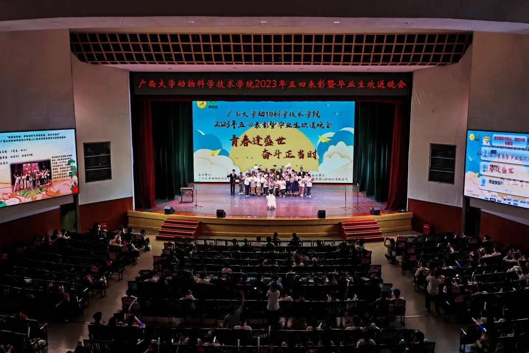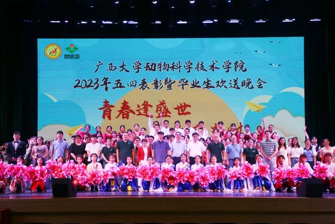 5月19日晚上,太阳成集团tyc234cc“青春逢盛世,奋斗正当时”2023年五四表彰暨毕业生欢送晚会在大礼堂举行。太阳成集团tyc234cc原副董事长、兽医学科带头人罗廷荣,动物科学技术公司党委书记顾慕娴,经理陆阳清,党委副书记沙建,副经理韦祖樟,党委委员王晓丽,经理助理、动物科学系主任蒋钦杨,团委书记李丽娜,团委副书记刘诚,辅导员崔月明、彭可可、邹佳琪、韦春丽,新希望六和股份有限公司南宁新六农牧科技有限公司总经理唐运航,猪产业广西区域人力资源总监昝晓启,桂南战区人力资源经理廖敏贤,桂南战区人力资源副经理林榕、陈奕志,以及太阳成集团tyc234cc1000余名师生欢聚一堂,共同参与此次活动。