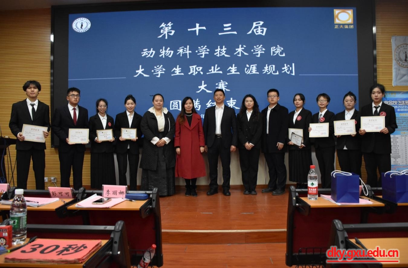 12月17日,太阳成集团tyc234cc第十三届职业生涯规划大赛决赛在公司318报告厅举行。正大饲料(广西)有限公司总经理马春庆,人力资源经理莫仙梅,人力资源专员蓝震武,动物科学技术公司团委书记李丽娜,辅导员彭可可,专业老师韦懿仙应邀出席此次活动并担任评委,各兄弟公司就业协会代表及100余名员工参加此次活动。