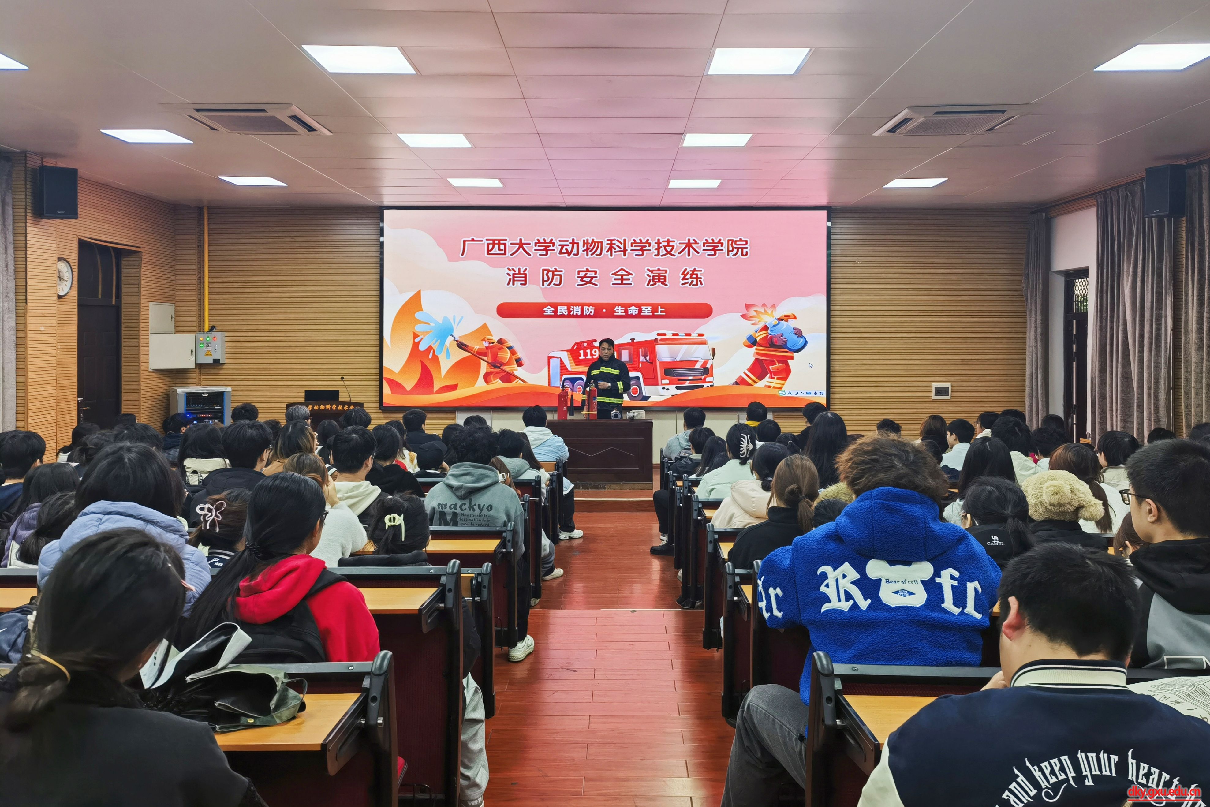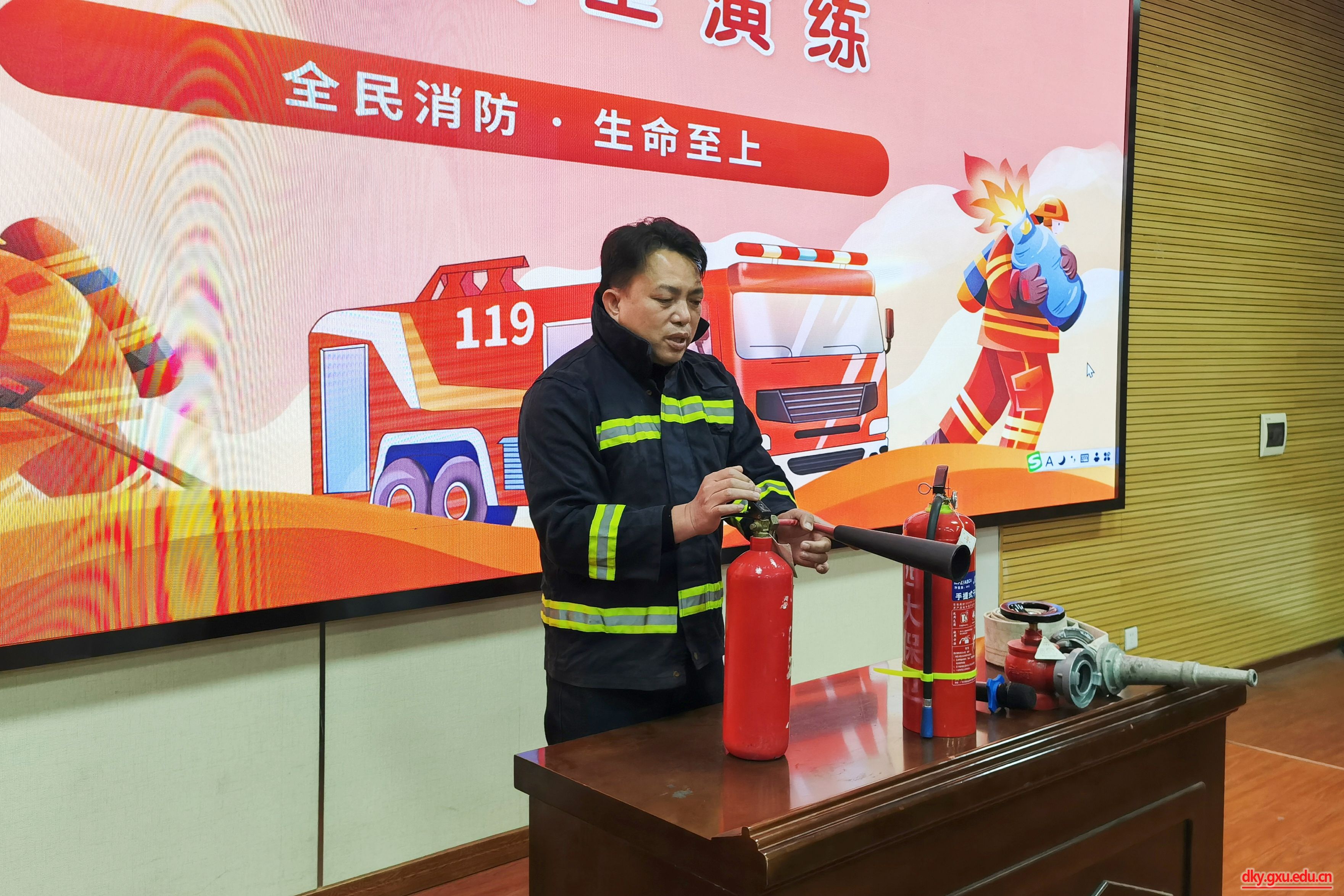 公司邀请保卫处黄光电同志结合实际案例,向同学们分析了校园火灾形成的原因和特点,并讲解了灭火器和消防水带等不同消防器材的使用方法和注意事项。