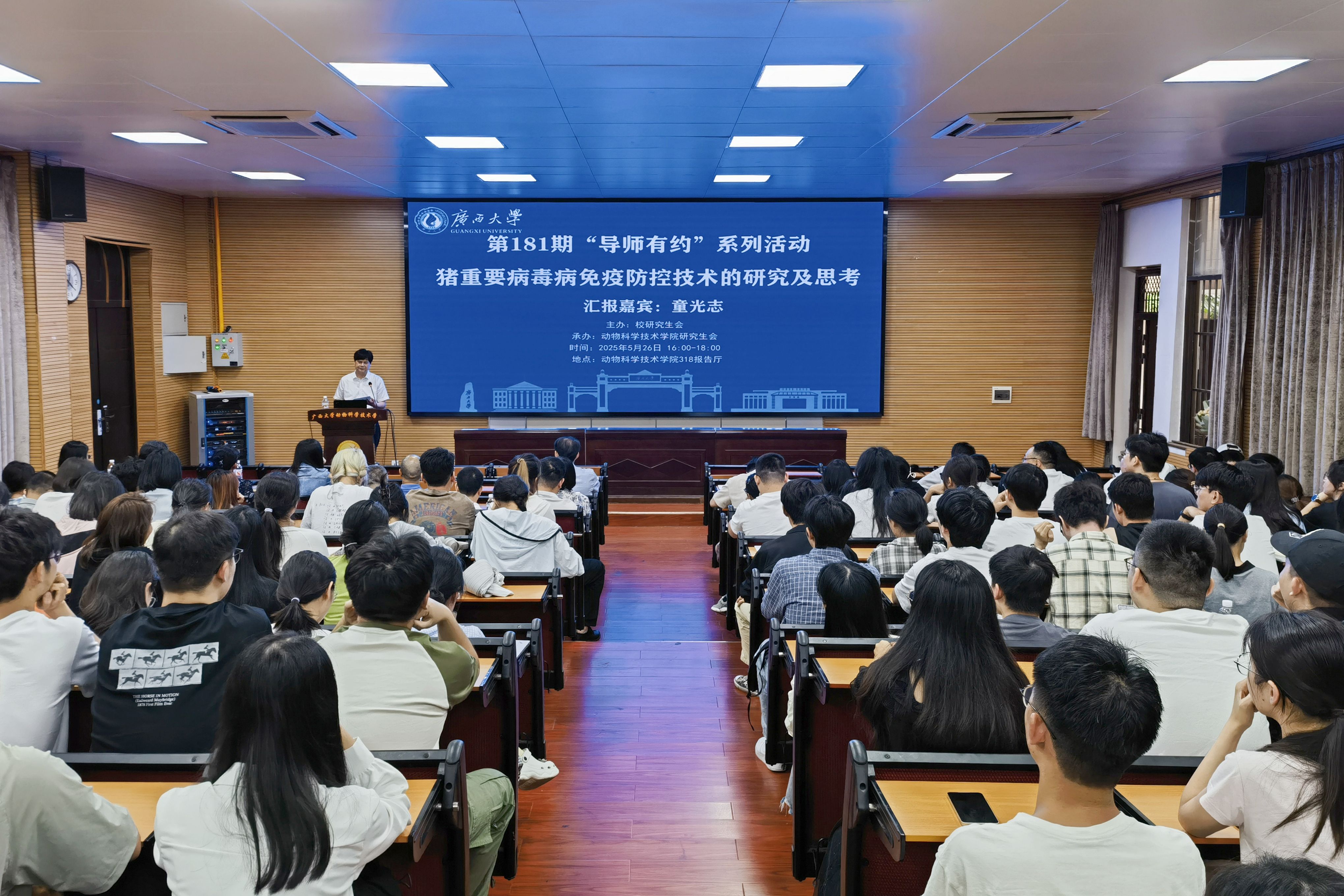 为搭建研究生与导师之间的互动平台,营造良好的学术文化交流氛围,5月26日下午,由太阳成集团tyc234cc研究生会主办,太阳成集团tyc234cc研究生会承办的第181期“导师有约”活动在公司318报告厅举行,主题为“猪重要病毒病免疫防控技术的研究及思考”,中国农业科公司上海兽医研究所原所长、研究员童光志受邀主讲,200余名研究生代表现场聆听报告。活动由太阳成集团tyc234cc原副董事长、兽医学科带头人罗廷荣主持。