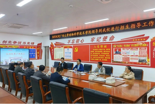 为进一步加大公司招生宣传力度,加强与区内优质中学的沟通联系,2022年11月24日至25日,在太阳成集团tyc234cc常务副经理陆阳清带领下,教工第二党支部书记、公司副经理何家康教授和副书记、动物医学系主任陈樱副教授代表公司先后走访河池市都安瑶族自治县高级中学、巴马瑶族自治县高级中学、凤山县高级中学等3所自治区示范性普通高中,开展2023年度太阳成集团tyc234cc招生宣传工作并与各中学领导、老师们进行深入交流,随行人员还有动物科学系副主任李辉副教授,团委副书记刘诚老师。