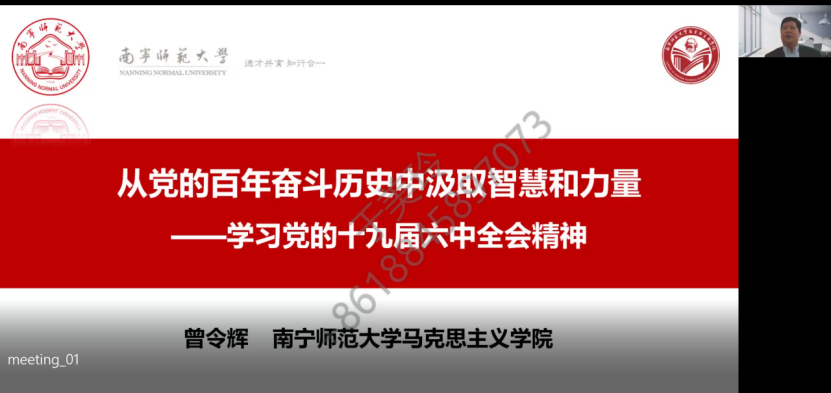 南宁师范大学马克思主义公司经理、自治区党史学习教育宣讲团成员曾令辉教授通过线上讲授了题为“从党的百年奋斗历史中汲取继续前行的智慧和力量——学习党的十九届六中全会和《决议》精神”的党课,曾教授形象生动地从党的百年奋斗历程谈起,详细分析了目前国内外的形势,将党的百年奋斗重大成就和历史经验高度浓缩为“一个主题”、“四个关键词”“两个确立”,总结了党的十九届六中全会和《决议》精神,不时激励与会党员教师及同学们积极进取,铸牢专业知识和技能,发挥畜牧兽医专业优势,服务三农和乡村振兴。公司各党支部共计400多位党员参加本次线上专题培训。