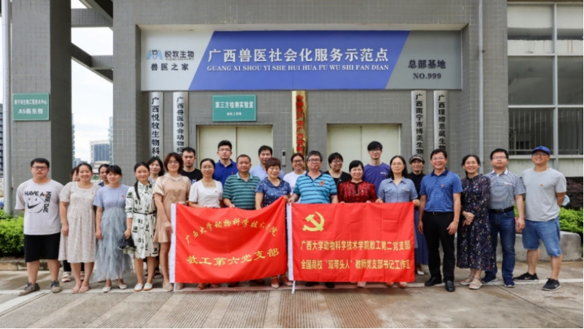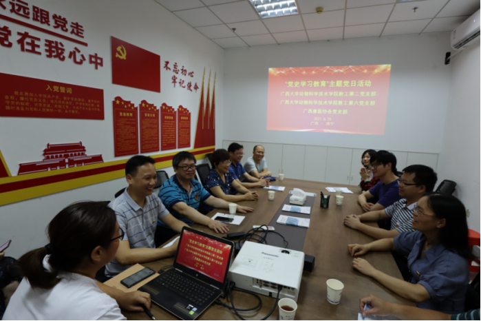 下午5:00,太阳成集团tyc234cc动科院教工第二、六党支部来到广西悦牧生物公司广西兽医社会化服务示范点,与广西兽医协会党支部联合开展“党史学习教育”主题党日活动。首先是刘红云博士介绍广西兽医社会化服务基本情况,并就社会化服务中有关兽医专家库与支部各位党员进行深入交流,并热忱邀请教工第二党支部党员发挥专业特长,积极报名专家库并参加提高广西兽医技能水平各项培训。接着,顾慕娴书记给全体党员同志上了一堂生动翔实的党课,顾书记指出,脱贫攻坚取得全面胜利是中国共产党对全国人民作出的庄严承诺,具有里程碑式的意义,通过党史学习教育,培养更多“知农、爱农”专业人才,加强院企合作,参与解决行业发展面临的困境,助力提升我区乃至全国畜牧业的竞争力。
