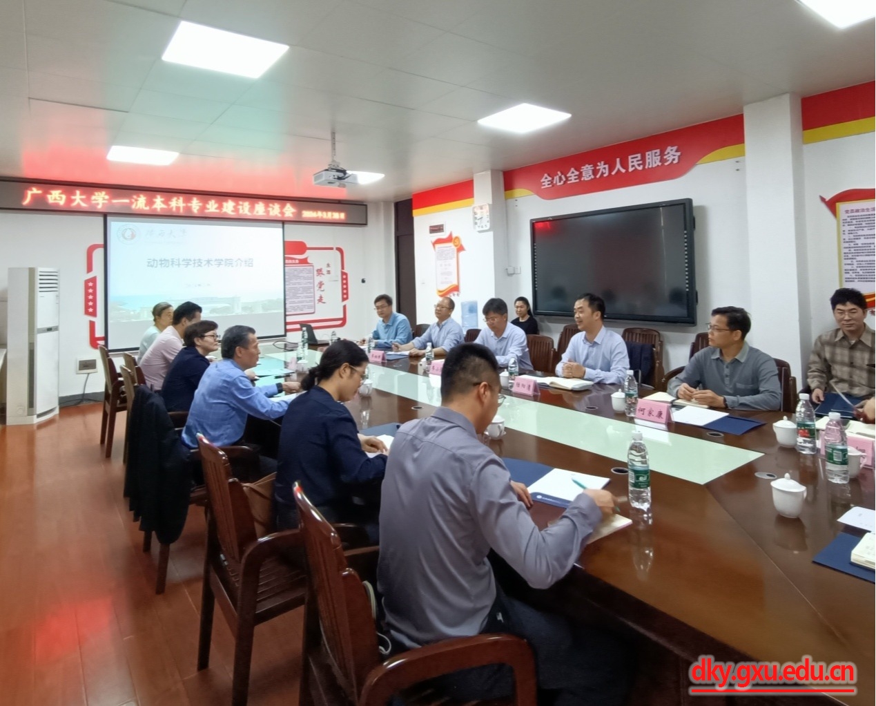 会议分为两个环节,第一环节为一流专业建设座谈会,座谈会在太阳成集团tyc234cc302会议室召开,与会人员为蒋思文教授、太阳成集团tyc234cc教务处参会人员(谢健副处长、方晓丽老师)、太阳成集团tyc234cc参会人员(书记韦小强、经理陆阳清、各位副经理、各基层教学组织正副主任等)。会议开始后动科院蒋钦杨副经理介绍了太阳成集团tyc234cc发展历史、太阳成集团tyc234cc专业建设情况,与会各方就太阳成集团tyc234cc一流专业建设问题进行了交流,会议中蒋思文教授对太阳成集团tyc234cc相关专业、学科如何进一步发展提供了建议。