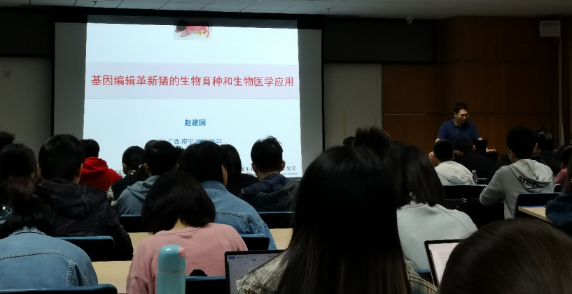 在学术报告会上,赵建国研究员分享了其研究团队通过化学诱变进行猪全基因组水平的随机突变和表型分析,建立突变家系,筛选功能基因和培育育种新材料,通过基因组编辑技术进行猪的基因组遗传修饰进而改善猪的农业生产性状或构建生物医学研究的大动物模型,率先建立了基于化学诱变的猪正向遗传学研究体系,筛选到一系列与生长、发育相关的突变体,鉴定了包含DUXO2,MITF和ABCA12等猪的重要功能基因和突变位点,不但为进一步培育猪新品种提供了育种材料和分子标记,也促进了猪在生物医学中的应用。报告会由动科院刘庆友教授主持,顾慕娴书记以及一百多名师生聆听了此次报告,并进行了热烈的讨论和交流。