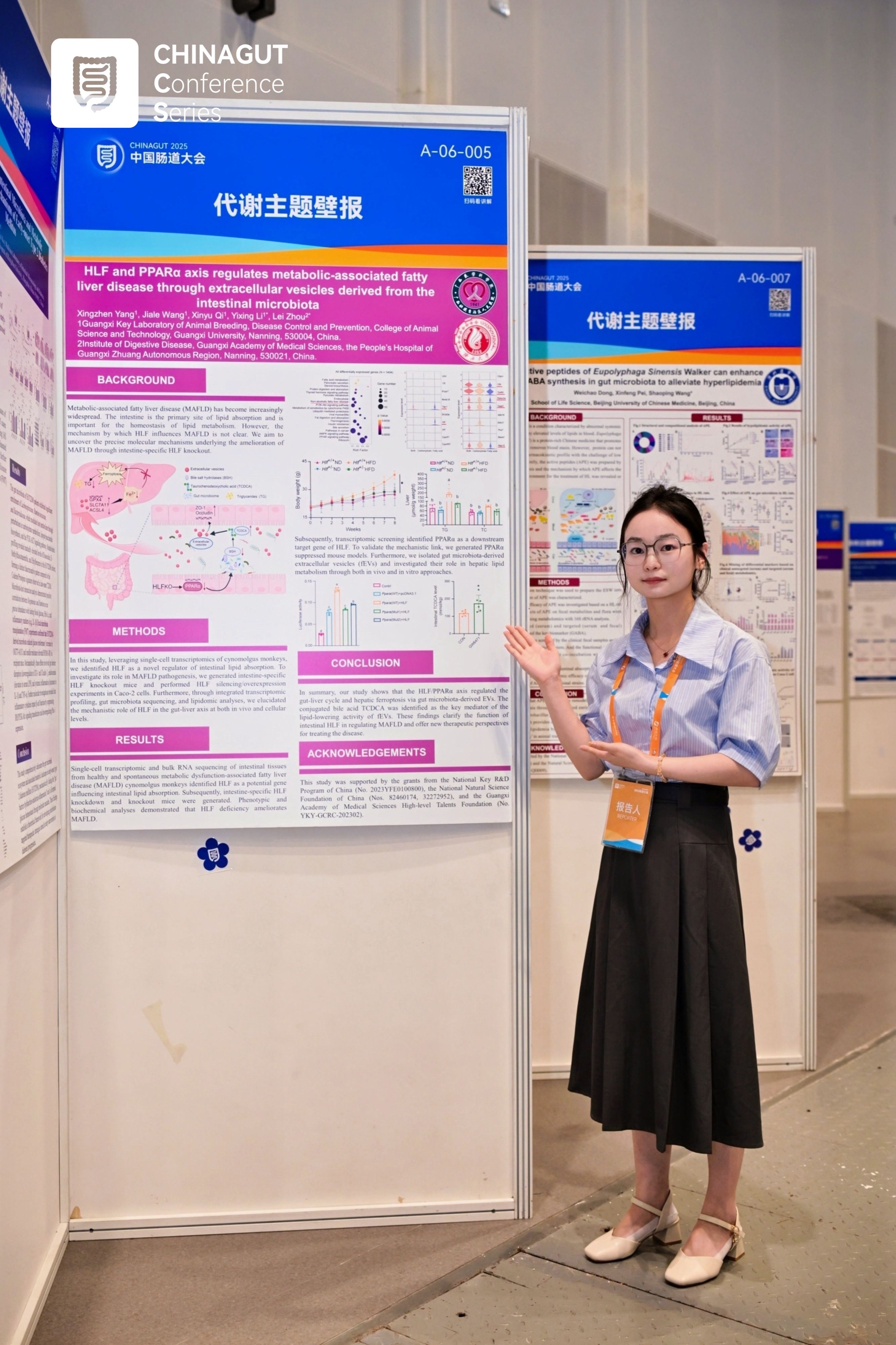 口头报告和壁报题目:HLF and PPARαaxis regulates metabolic-associated fatty liver disease through extracellular vesicles derived from the intestinal microbiota(已发表,中国科公司一区TOP SCI,IF:23.8,实时IF:35)。