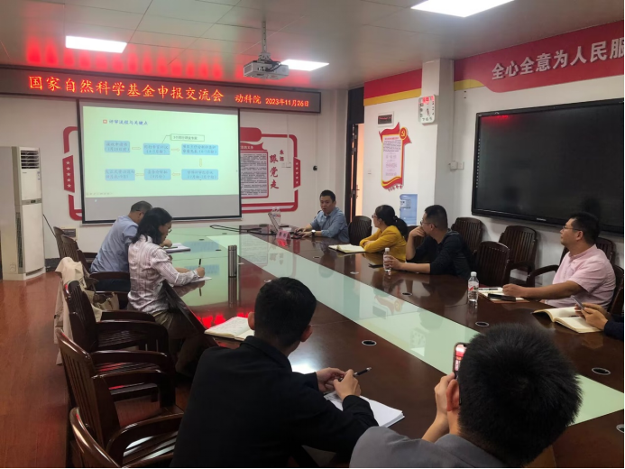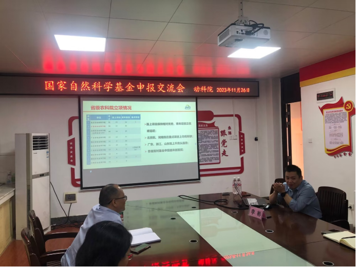 在学术报告结束之后,李彬研究员与动科院老师在302会议室进行了座谈。李彬研究员首先分析了近两年国家自然科学基金的申报和立项情况,接着从亲身经历总结分享了基金立项成功的三要素:选好题是关键、良好的研究积累和高质量的申请书,对项目申报书各项组成的撰写提出了宝贵建议,随后还分享了兽医学科近十年项目的申报情况和各二级代码的统计情况,最后与参会老师就国基项目申报进行了答疑和交流。